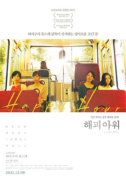 영화 해피 아워는 12월 9일 개봉하는 영화로 각기 다른 성격 직업을 가진 30대 후반의 네 명의 친구들이 가심 깊숙하게 있는 여러 상처와 진실들을 마주하면서 스스로에 대해 알아가고 진짜 행복을 찾아가는 이야기를 담은 영화이다. 영화 해피 아워는 일본의 거장 감독 하마구치 류스케 감독의 신작으로 러닝타임이 무려 328분이라고 한다.